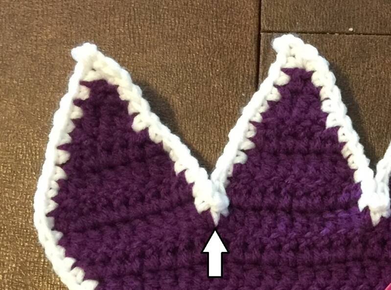 You are now going to attach your yarn at the base of the second crown point you made, just like the last time